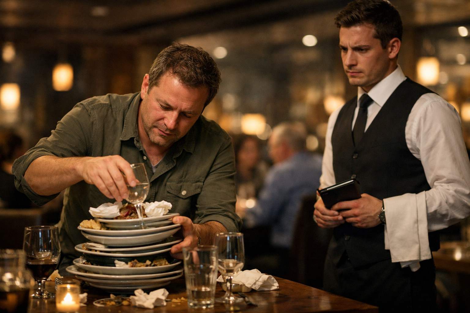 The plates were still warm when you stacked them. A half-full glass of wine perched dangerously on the edge of your improvised tower, cutlery balanced precariously. The server approached with a tight smile, that tiny flicker in their eyes you read as gratitude. You felt proud, almost virtuous. You were “helping”.